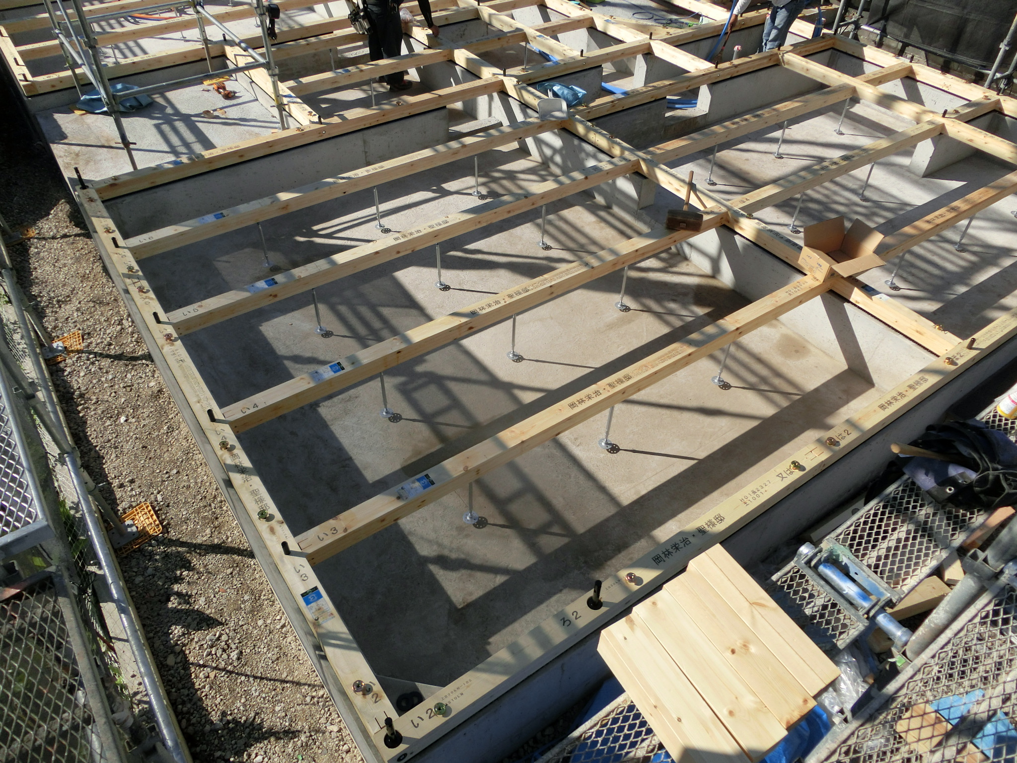 基礎工事も完了し、6月9日の上棟に向けて、土台敷きと大引(おおびき)の取付をしています。クレバリー独自の柱接合金物に注目です。